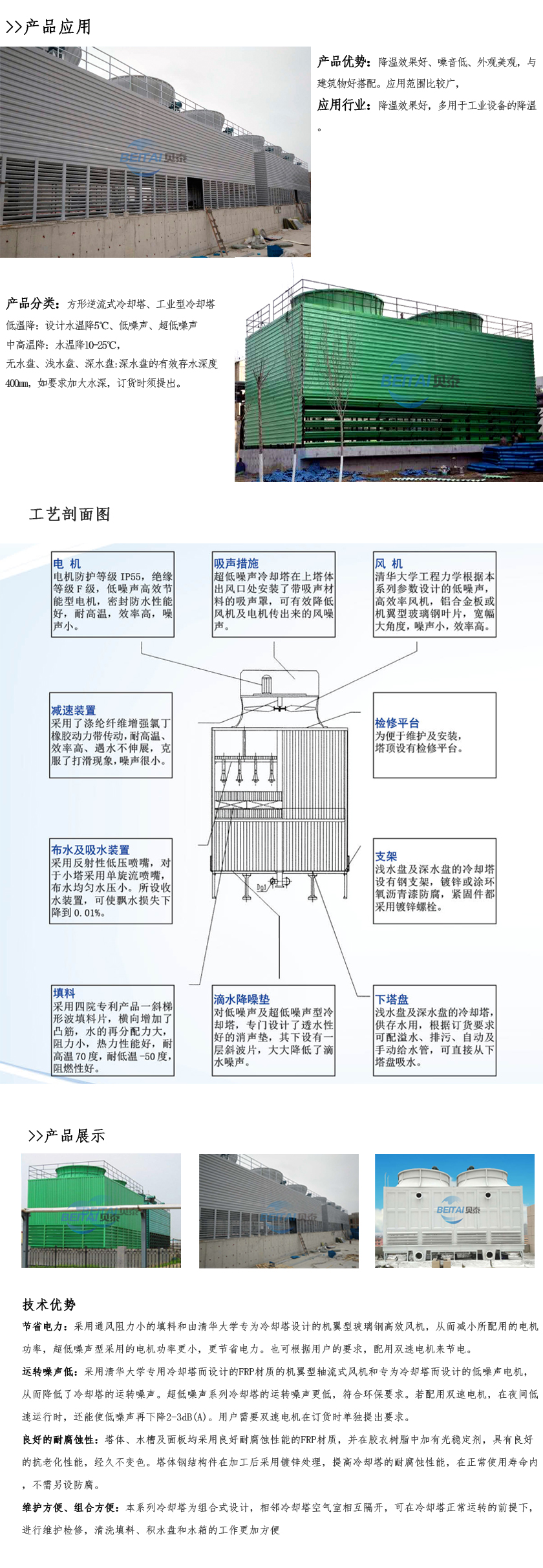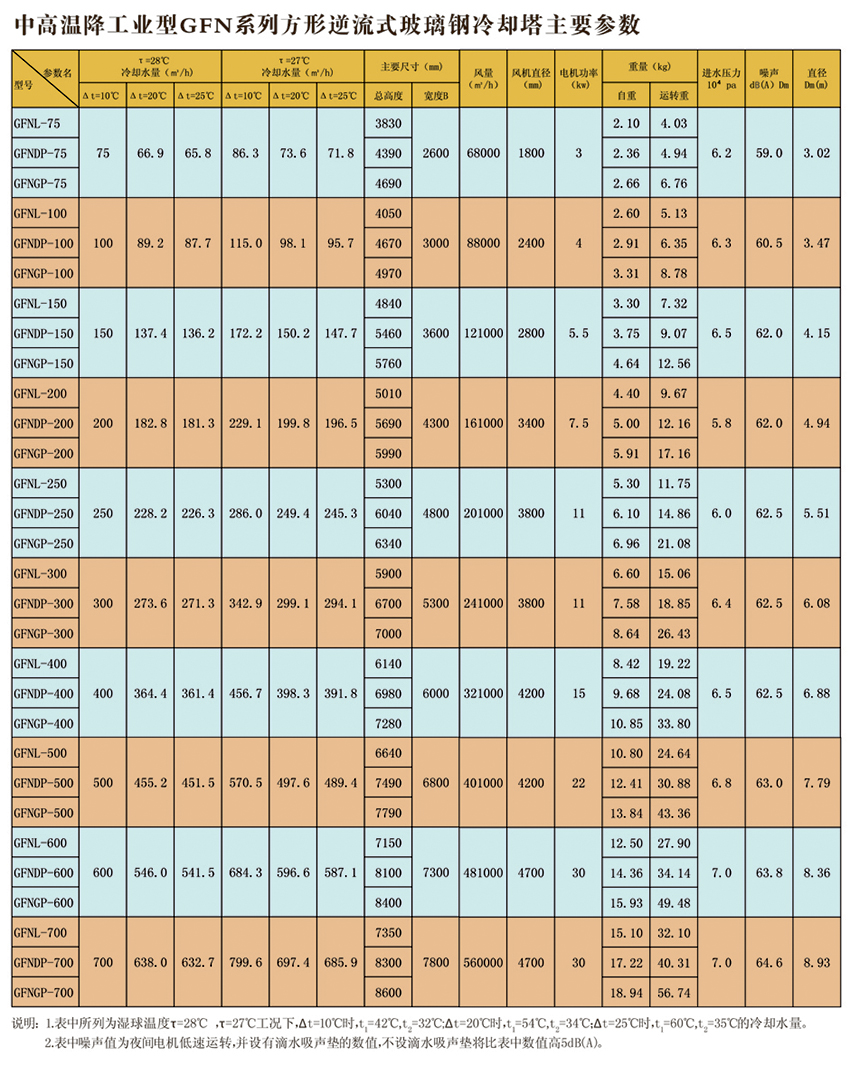 工業(yè)型玻璃鋼冷卻塔,室友機械工業(yè)部第四設計研究院在原設計的同類塔測試數(shù)據(jù)基礎上改進設計的。本設計的特點是冷卻塔風機配有變扭矩雙速電機;當氣溫較低時,例如晚上,電機開低速,冷卻噪聲可低3-5dB(A)。此外,選用雙速電機節(jié)電顯著。多臺冷卻塔配單速電機時,為了節(jié)電,當空氣濕球溫度低時,可停部分電機,但仍比用雙速電機(以年計)多耗電40%。