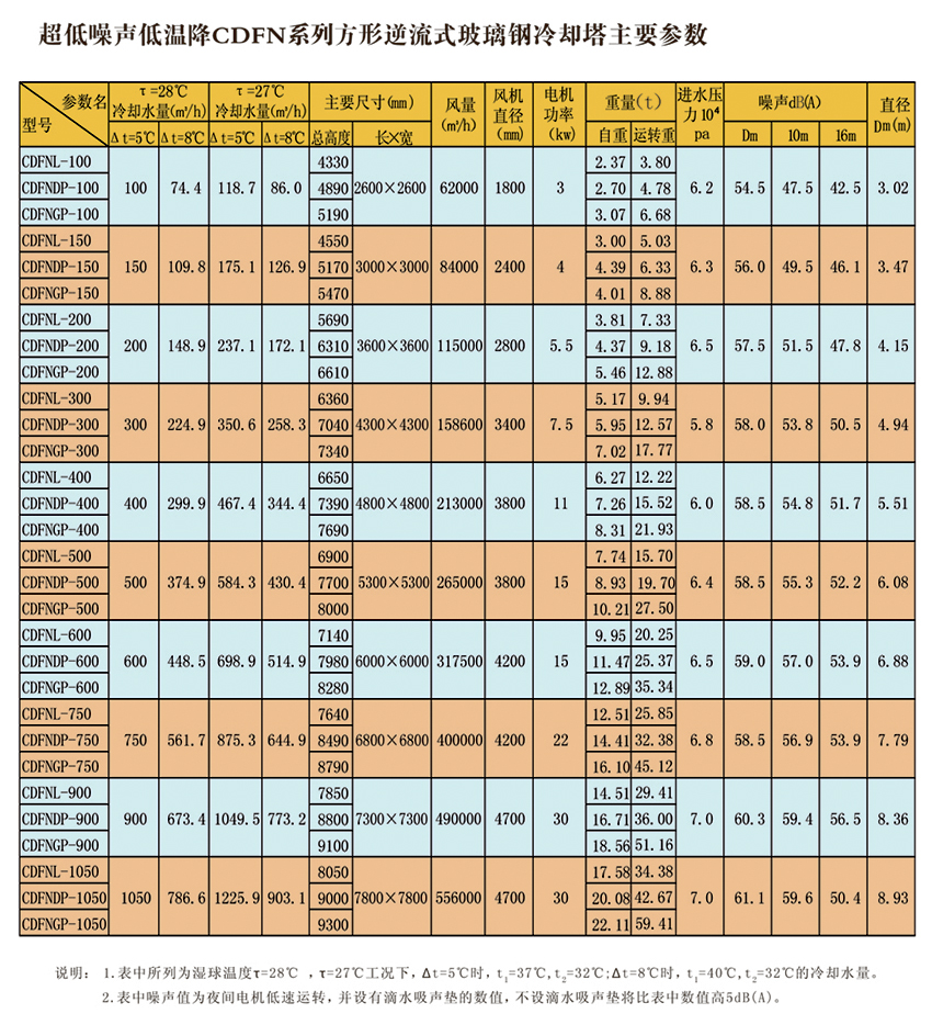 方型逆流式玻璃鋼冷卻塔,室友機械工業(yè)部第四設(shè)計研究院在原設(shè)計的同類塔測試數(shù)據(jù)基礎(chǔ)上改進設(shè)計的。本設(shè)計的特點是冷卻塔風(fēng)機配有變扭矩雙速電機;當(dāng)氣溫較低時,例如晚上,電機開低速,冷卻噪聲可低3-5dB(A)。此外,選用雙速電機節(jié)電顯著。多臺冷卻塔配單速電機時,為了節(jié)電,當(dāng)空氣濕球溫度低時,可停部分電機,但仍比用雙速電機(以年計)多耗電40%。